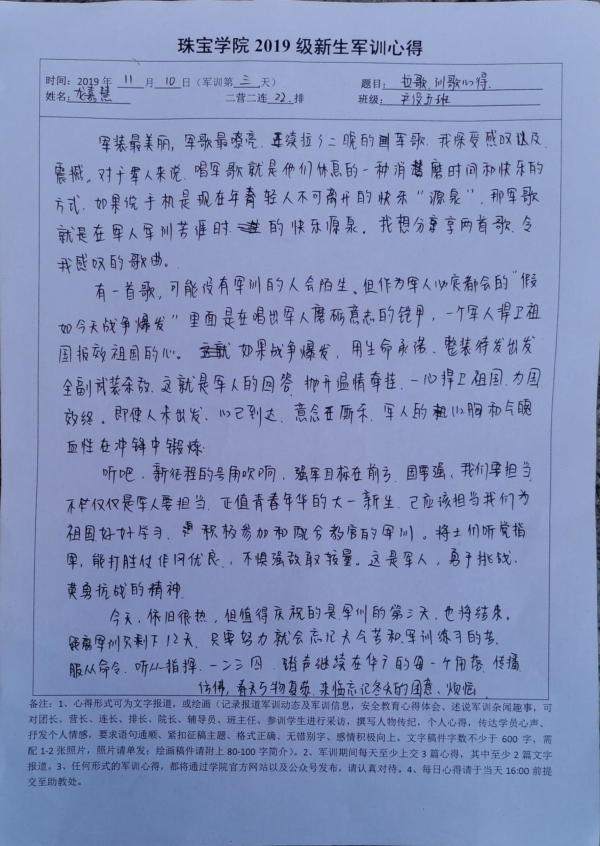 *2019级新生军训心得——19级产品设计5班龙嘉慧(军歌嘹亮) 2019/11/10