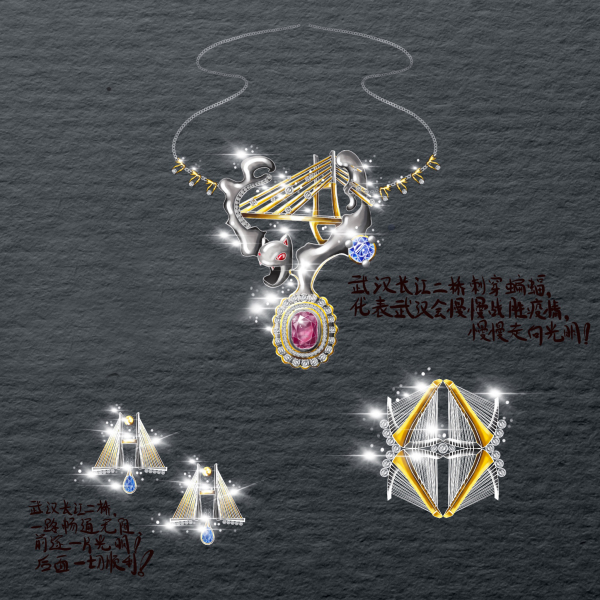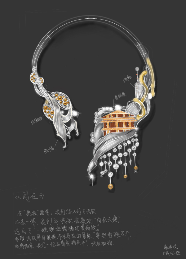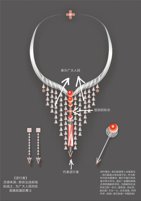 法国思想家罗曼罗兰说过:“艺术的伟大意义,基本上在于它能显示人的真正情感、内心生活的奥秘和热情的世界。”珠宝学子纵然不能奋战在抗疫前线,但在这个特殊的时期我们手中的画笔不停,创作不止,以此来记录着共克时艰的中国人民、表达着对抗疫先锋们的崇高敬意,歌颂着发生在身边的每一个感人事迹,用珠宝设计的艺术鼓舞着彼此。让我们坚定信念,不负韶华,待春暖花开,拥抱蓝天白云。