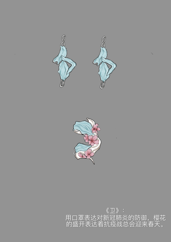 设计说明:自新冠肺炎的发生以来,国家的支持,一线医护人员的守护,口罩的防御,这次抗疫之战终会迎来春天。作品以口罩、樱花、白色丝绸为元素。口罩代表着对新冠肺炎的防御,樱花的盛开代表着武汉终会百花齐放,生机勃勃,白色丝绸代表着一线医护人员的防护服,给病人们带来无穷的力量。“春暖花开,病痛不再”