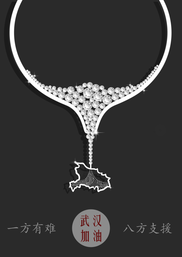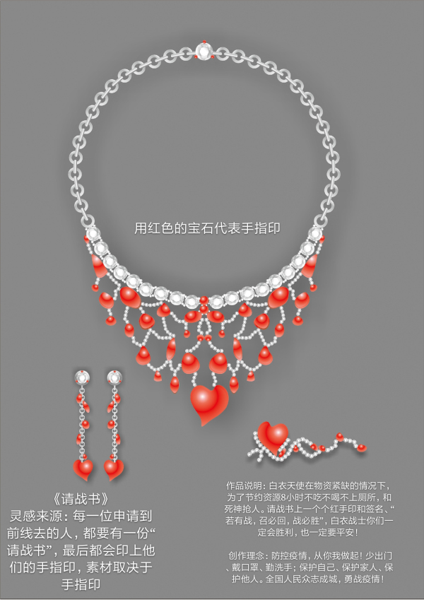 设计说明:用了沙漏的元素,表达支援的时间必须争分夺秒,并且沙子汇聚的形态就像大家从各地赶来支援。将颈环里的宝石比作各界人士的力量,尽自己所能支援武汉。大家从四面八方赶来支援的身姿,就仿佛是流进武汉人民心中的一股暖流。所以宝石们的汇聚点便是湖北省的样子,并用花丝这种优美的工艺来表达暖流。