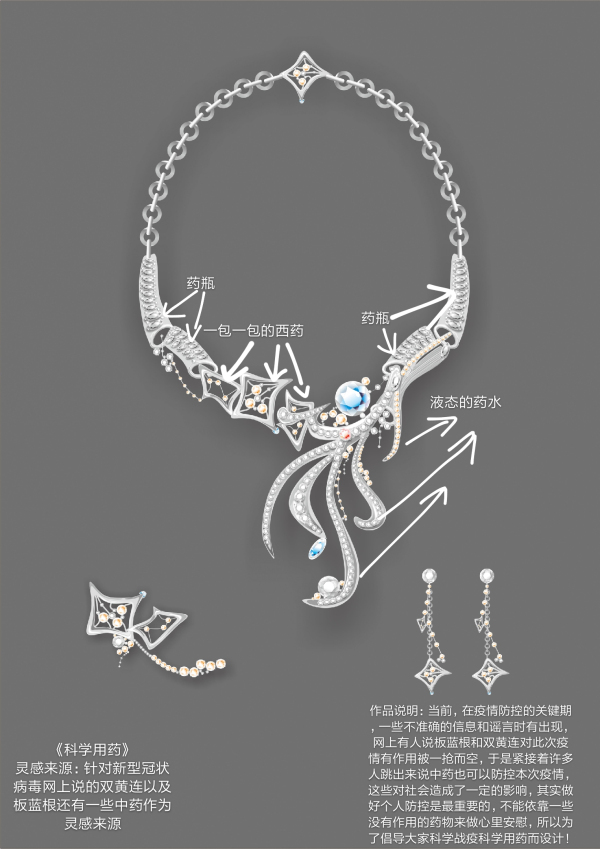 设计说明:元素来源于生活,这次“抗疫”我们最需要的就是勤洗手保持干净,作者选用了水作为设计元素,想表述的是希望大家可以通过水带走病毒,而作品中的三颗绿宝石代表的就是本次疫情的病毒,希望借此能表达病毒并不可怕,只要我们共同努力就可以冲走病毒。耳环作为统一元素的套件,至于不加绿宝石,是为了保持首饰的纯洁,希望表达病毒已经被冲洗干净。