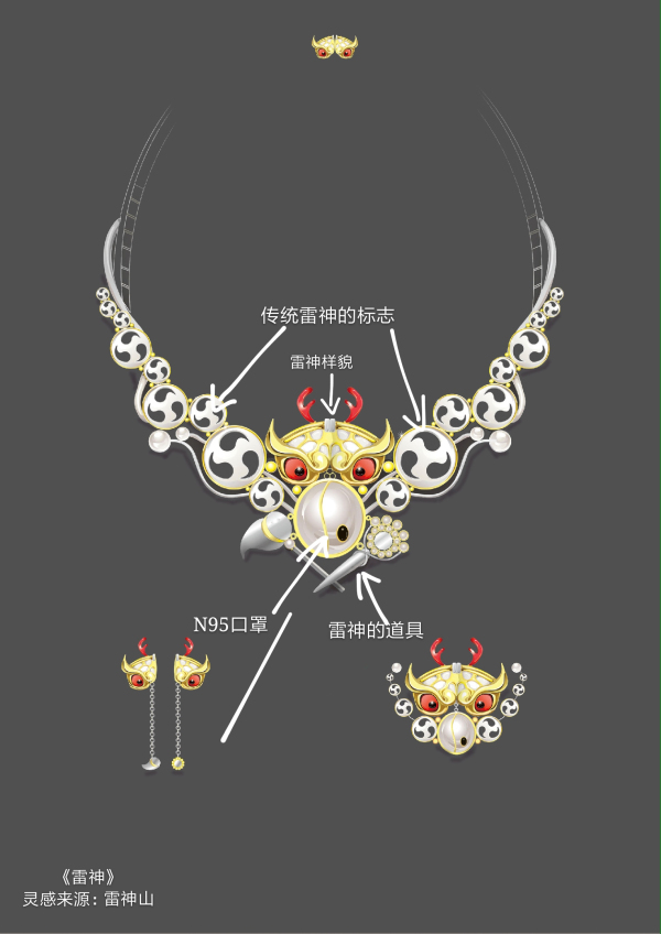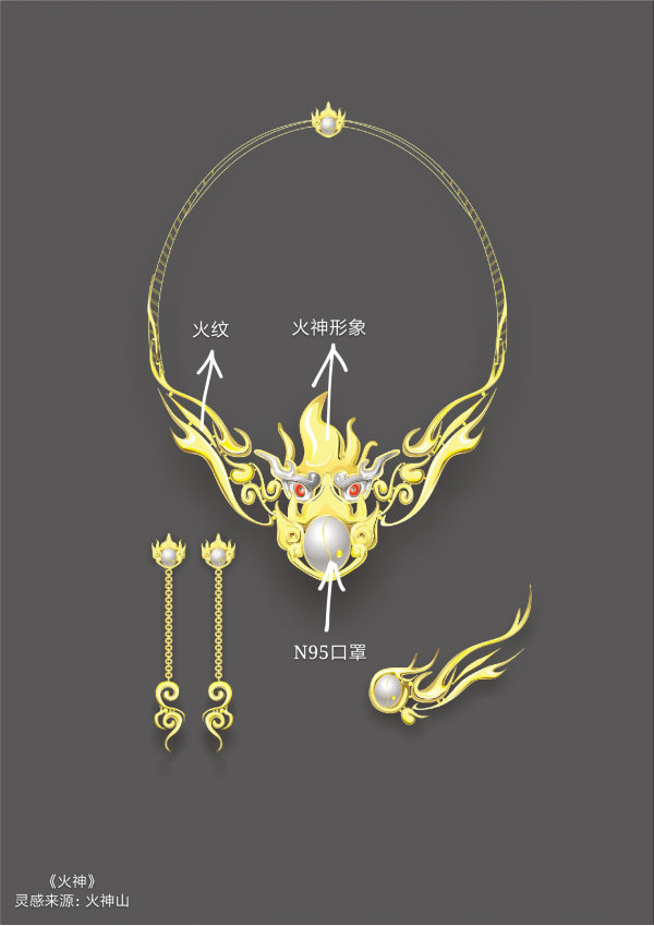 设计说明:口罩在疫情中起到隔离空气大大小小的病毒,还作品才用了口罩的元素进行几何变形,外围用八爪镶的钻石进行重复排列表示病毒,在这单调的排列中添加了几个写实的病毒进行点缀烘托!材料,18k黄金,编织,小钻。