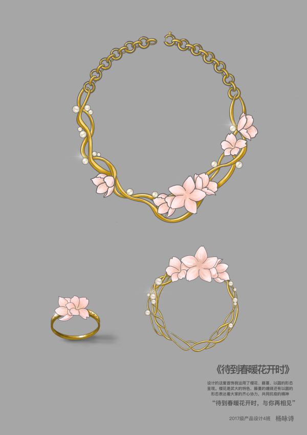 设计说明:以“待到春暖花开时,与你再相见。”这句话为思路,设计的这套首饰主要运用了樱花、藤蔓、的元素以圆的形态呈现。樱花是武大的特色,藤蔓的缠绕还有以圆的形态表达着大家的齐心合力,互帮互助,共同抗疫的精神。