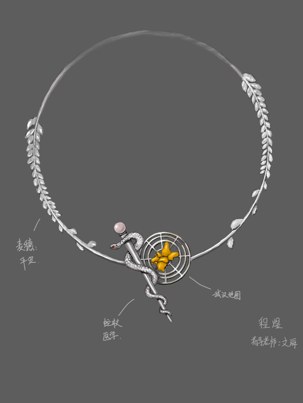 设计说明:“锦”谐音颈,项链。“玉”谐音愈,治愈。“江城”则是武汉的别称。这件作品的灵感来源于医院的标志而想出来蛇杖这个元素,整件作品采用银饰展现出灰色调的阴郁风格,蛇杖作为医学的标志象征神奇的医术和高尚的医德与旁边的武汉地图紧密相连,表达了国家和每一个人希望武汉的疫情能得到治疗,也致敬迎难而上的白衣天使。麦穗这个元素寄托了我们每一个人最大的祝愿:平安。希望疫情早日过去,同舟共济武汉加油。