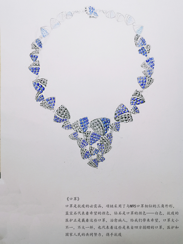 设计说明:口罩是抗疫的必需品,项链采用了与N95口罩相似的三角外形,蓝宝石代表着希望的颜色,钻石是口罩的颜色——白色,抗疫的医护正是戴着这些口罩,治愈病人,给我们带来希望,口罩大小不一,不大一样,也代表着这些是来自四方捐赠的口罩,医护和国家人民的共同努力,携手抗疫。