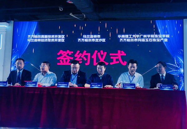 冯敏(右三)代表伟德国际1946与齐齐哈尔市玛瑙玉石珠宝产业签约(王辉 摄)