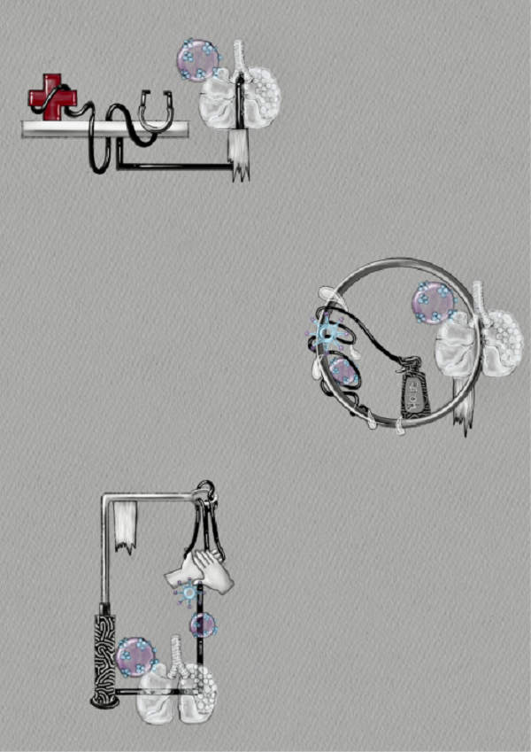 设计说明:使用新冠肺炎影响最深的肺部,如同腐烂的形象,还运用了新冠病毒的形状,在做以上行为时会如同举出白旗投降。这个系列如同一个防护手册,列出了抗疫期间需要注意与可预防的行为,分别为打疫苗、佩戴口罩、做好核酸检测、日常酒精消毒、勤洗手消毒、不隐瞒寻求医护人员的帮助。