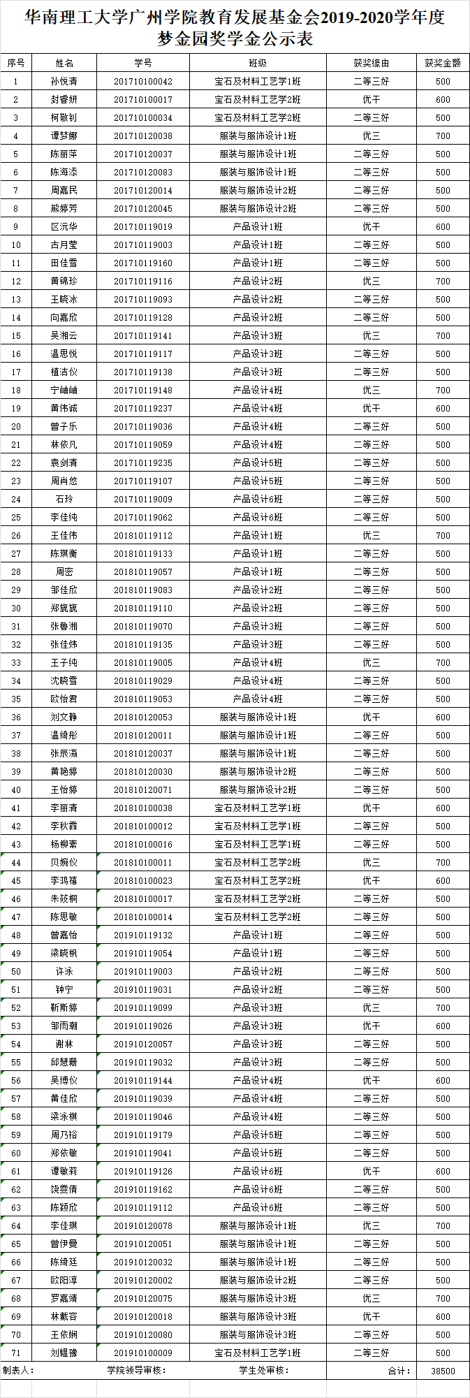 2020年12月1日-12月15日,我校开展了2020年ZEGL奖学金、旭平奖学金、梦金园奖学金评审工作。根据相关管理规定,经学生工作处评选审核,现对初审通过学生名单(见具体表格)予以公示,并就有关事项通知如下:
