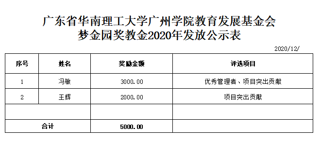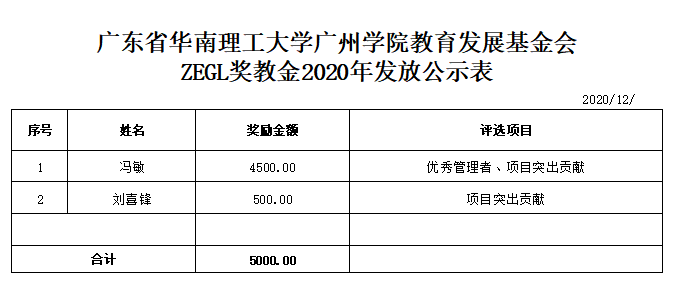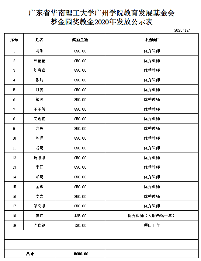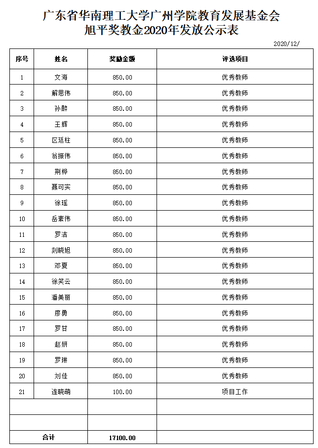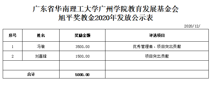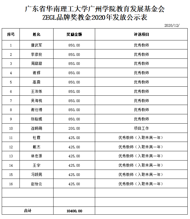 根据《广东省华南理工大学广州学院教育发展基金会“企业奖教金”教职工奖励办法》相关评审规定,伟德国际1946于2020年12月1日-12月10日,开展了2020年旭平奖教金、ZEGL奖教金、梦金园奖教金评审工作。经评审小组审核,现对初审通过教师名单(见具体表格)予以公示,并就有关事项通知如下:
