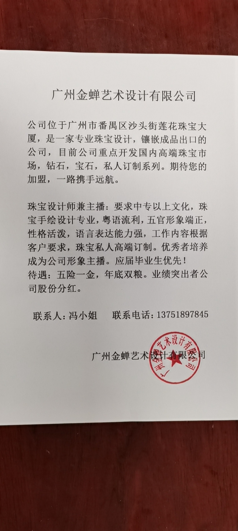 广州金蝉珠宝招聘珠宝设计师岗位,限女生