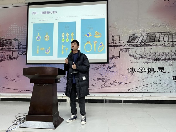 青年教师黄维海,以“首饰建模,熟能生巧”为主,介绍了全国贵金属首饰制作工(3D建模)职业技能竞赛赛事规则和要求,根据自身参赛经验强调,首饰建模难度不高,在掌握基本操作情况下,反复实操可达熟练。同时,黄维海鼓励同学们要有“宜早不宜迟”的学习态度,踊跃参加。
