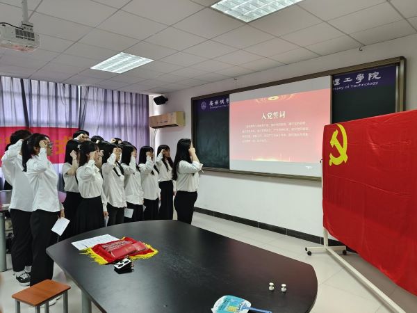 入党宣誓仪式在庄严的《国际歌》中正式开始,全体党员在雄浑昂扬的旋律中起立肃穆。支部书记马锦娴宣读本次新发展预备党员名单。接着,全体新党员面向党旗站立,举右手握拳,在学院组织员梁冰同志的领誓下,进行了庄严宣誓。铮铮誓言,拳拳红心,党员们昂首挺胸,在阵阵激昂的宣誓声下,每个党员均用心传递着他们昂然向上的斗志和报效祖国的决心。宣誓完毕后,学生党支部书记马锦娴、学生党支部副书记文嘉俊为新发展预备党员们佩戴党徽并赠送《中国共产党章程》。梁嘉雯代表预备党员发言,她表示自己会用实际行动证明自己的初心,努力加强自身政治理论学习,提升思想道德素质,并在实践中不断完善自我。