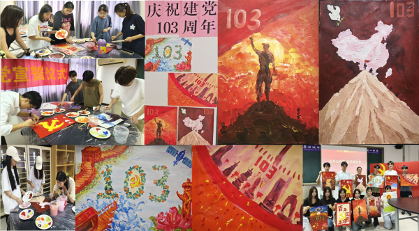 党课学习结束后,学生们进行了实践活动,围绕建党103周年为主题,进行了彩绘创作。每一笔,每一划都表达着珠宝学子拥护党、热爱祖国的真挚情怀。创作结束后,优秀作品在A7一楼展出,引来学生驻足欣赏。