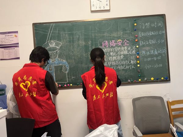 活动当天,党员们早早来到C15学生宿舍楼下,准备好绘画工具便开始投入到黑板报的绘制工作中。他们分工明确,有的负责勾勒轮廓,有的负责填充色彩,还有的负责书写文字说明。在绘制过程中,党员们不时地讨论如何更好地呈现内容,以确保黑板报能够清晰、准确地传达网络诈骗的防范要点和网络安全知识。