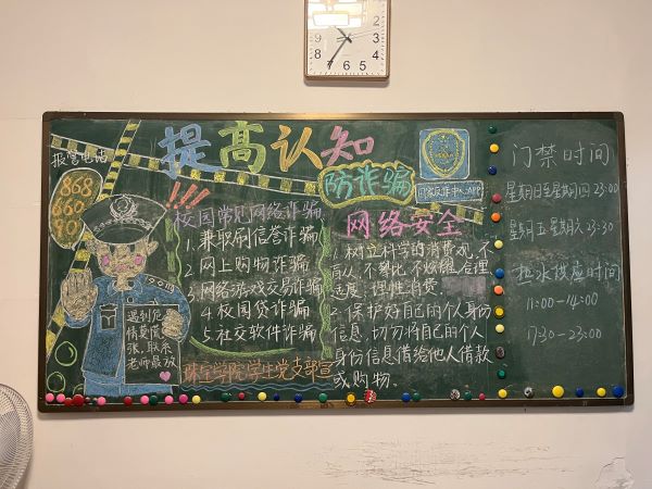 在当今数字化时代,网络已经深入大学生的学习和生活,但与此同时,网络诈骗也日益猖獗,网络安全问题频发。伟德国际1946学生党支部敏锐地意识到提高同学们网络安全意识的重要性,希望通过在宿舍楼下绘制黑板报这种直观且贴近学生生活的方式,让同学们在日常出入宿舍时就能接受到相关知识的普及。