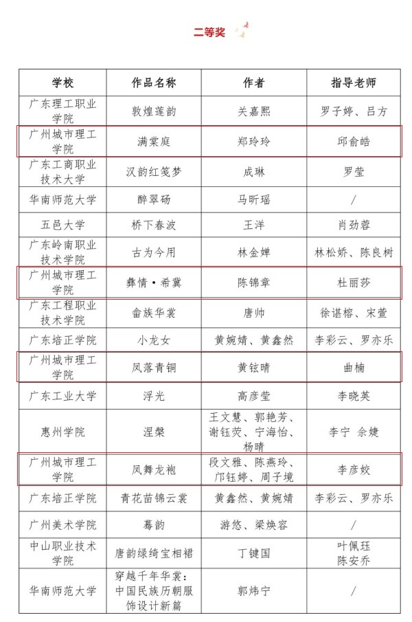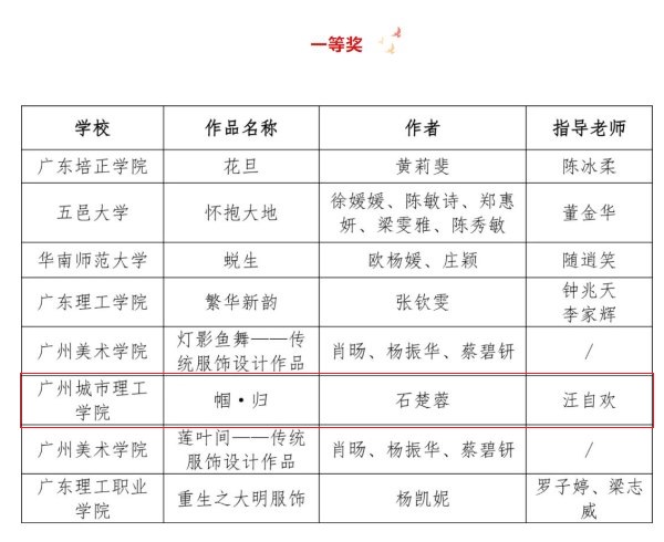 本网讯(记者 李彦姣)10月15日,由广东高校网络思想政治工作中心主办、佛山职业技术学院承办的“广东高校传统服饰设计作品征集活动”的获奖结果在近日公示,我校在36所高校,350余件作品中脱颖而出,共获得一等奖1项,二等奖4项,三等奖1项的好成绩。