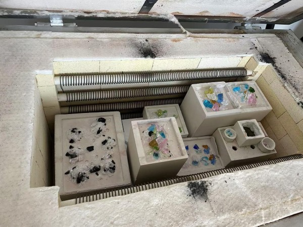 工作坊的最后阶段,学生们学习了如何准备铸造所需的玻璃材料,并进行模具填料的处理与温度曲线的设置。学员们亲自操作窑炉,调整温度曲线,确保玻璃铸件的稳定性与成品质量。在老师的指导下,学生们顺利完成了铸件的入窑与退火过程,尽管作品需要经过漫长的烧制与冷却过程才能完成,但每位学员都充满了期待,期待美丽作品的最终呈现。