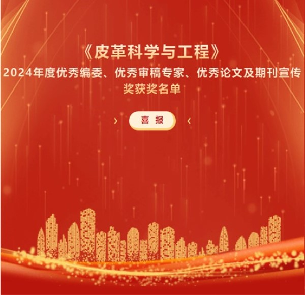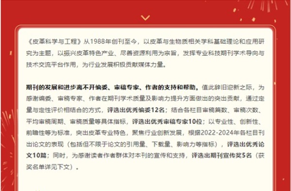 本网讯(记者 谢辉)2025年1月2日,皮革科学与工程杂志社为感谢编委、审稿专家、作者在期刊学术质量及影响力提升方面做出的突出贡献,通过定量与定性评价相结合的方式,评选出优秀编委12名;结合各栏目审稿篇数、审稿次数、平均审稿周期、审稿质量等具体指标,评选出优秀审稿专家10位;以专业性、创新性、前瞻性等为标准,突出皮革专业特色,聚焦行业创新发展,根据2022-2024年各栏目刊出论文的表现(包括但不限于论文的引用量、下载量、影响力等指标),评选出优秀论文10篇。