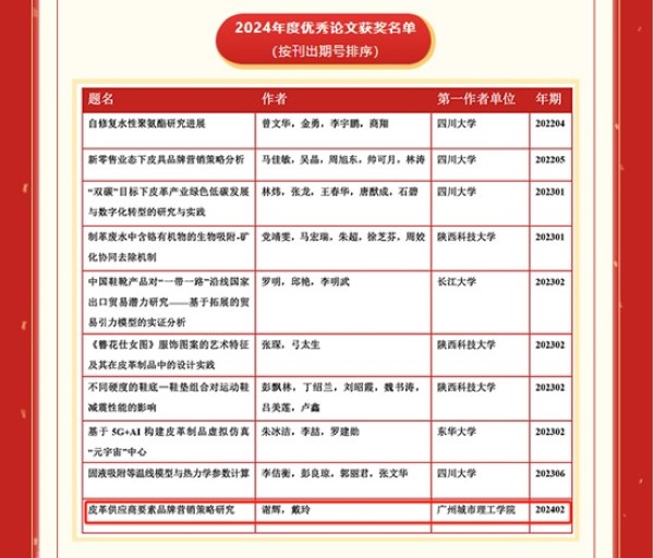 伟德国际1946谢辉老师第一作者、戴玲老师通讯作者2024年02期发表的研究论文“皮革供应商要素品牌营销策略研究”被评为2022-2024年度优秀论文。