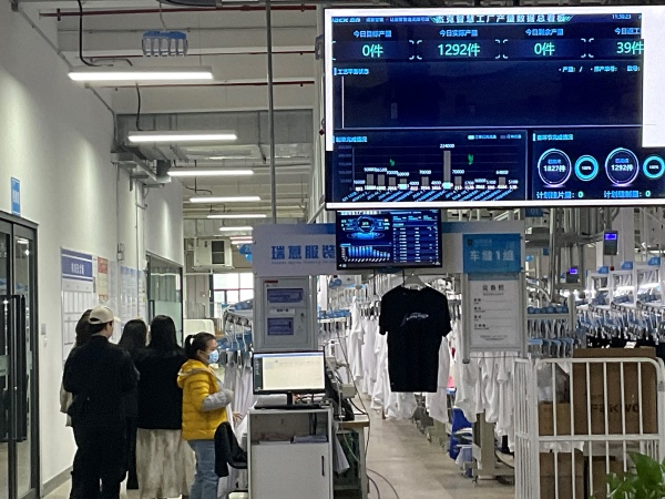 活动期间,专业负责人刘佳与部分教师参观了瑞蒽服装有限公司的展厅与智能制造流水线。在展厅中,教师们看到了一系列创新的服装产品和设计理念,这些都为服装与服饰设计专业的教学提供了丰富的灵感和实践案例。在智能制造流水线的参观中,他们目睹了全自动吊挂系统、电脑自动裁床等高科技智能设备的高效运行。这些设备不仅提升了生产效率,还显著改善了产品质量和车间环境。通过数字化面板,企业管理层能够实时监控生产进度,及时调整生产计划,确保订单的精准交付。