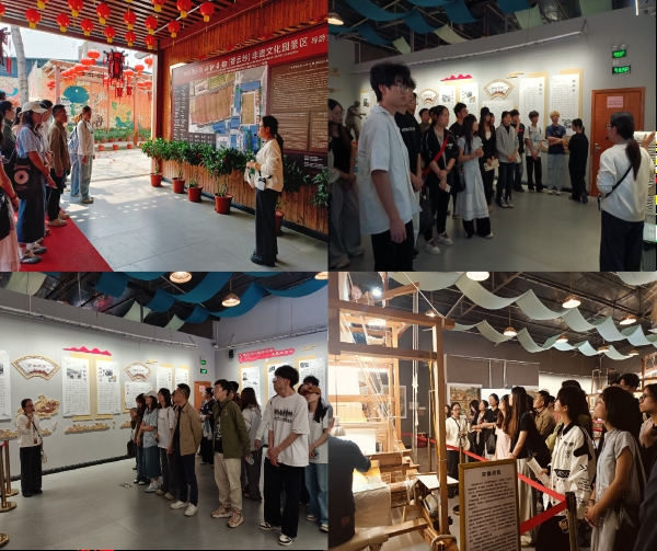 4月7日下午,师生们在香云纱非遗文化馆开展了一场意义及趣味并存的学习体验活动。馆内设有四个展厅,分别介绍疍家文化,海上丝绸之路和罗及锦等丝织品,香云纱服饰及其相关物品等传世珍品,抽丝成线的工具以及各类大型纺织机等,让师生们能够身临其境地感受到浓厚且独特的香云纱文化。讲解员介绍了古老的香云纱“三蒸九煮十八晒”生产工艺技术,以及民国以来的部分香云纱服装真品,展示了香云纱从白坯纱罗反复上色发酵、晾晒生成红云纱,由红云纱过泥生成香云纱的质变过程。更为震撼的是,馆中展出的两台提花罗织机,至今还能织造,现场还有专业织造师傅正在织造提花纱罗和宋锦,让生长在当代的师生们如同穿越回到了古代。