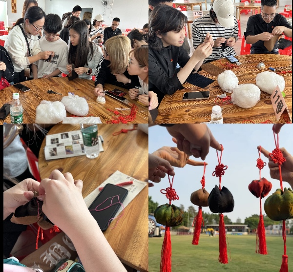 参观结束后,师生们跟随讲解员的指引到手工室进行非遗体验,靛蓝、黛紫的香云纱碎片在师生们手中重获新生。在讲师的指导下,师生们手持针线、布料和香料,小心翼翼地穿针引线,将香云纱布料对折,用细密的针脚沿着边缘开始缝制,根据自己的喜好将适量的香料装入香囊中。折叠成三角形状,再将香囊的小口缝合起来,确保香料不会漏出。在缝制布料、填塞棉花、串联中国结的步骤中,师生们从中领悟到了手工制作需要的耐心和细心,也感受到了非物质文化遗产的独特魅力。20222级视觉传达设计专业的潘同学说道:“香云纱独特的质感和色彩,以及香囊的设计,都展示了传统工艺与美学的结合。在制作过程中,我感受到了艺术创作的乐趣和挑战。也让我认识到保护和传承这些传统技艺的重要性”。学生党员谢彤也表示此次党日活动使她感受到香云纱作为“软黄金”的珍贵,更深刻体会到非遗传承的深层意义,它不仅是技艺的延续,更是文化自信的传递。