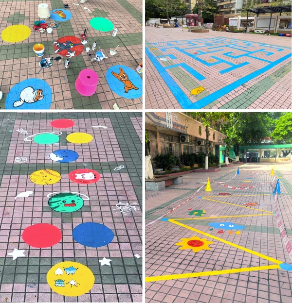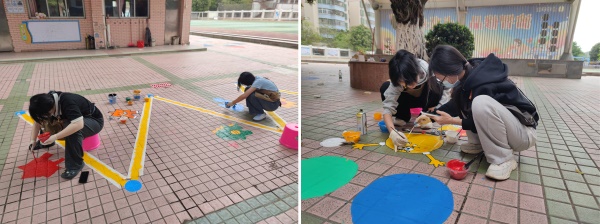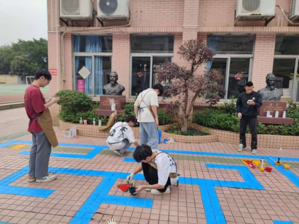 活动过程中,同学们热情高涨、配合默契。在折线跑游戏组,两位同学分工协作,一位用粉笔画出草图,另一位则用美纹纸贴出绘画路线,随后共同上色,有条不紊地推进着创作。而在绘制难度较大的大面积迷宫游戏区域时,五位男同学充分发挥空间思维能力,迅速计算出地面绘画的距离,合理分工,大大提高了绘制效率。井盖组的同学们更是创意无限,他们凭借丰富的想象力,在井盖上绘制出许多充满童趣的卡通图案,让原本单调的井盖变成了校园里的亮丽风景。
