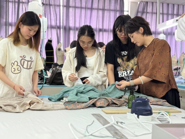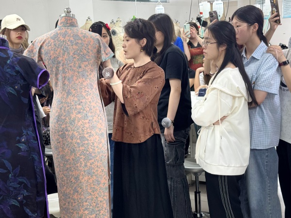 “旗袍不仅是服饰,更是东方美学的立体诗篇。”课程伊始,陈禾汝老师以一件传统旗袍为教具,从历史脉络切入,梳理了京派、海派旗袍的演变历程。围绕传统旗袍的“镶、嵌、滚、宕、盘”等传统工艺,陈禾汝指导学生亲手制作传统旗袍。从无中生有的归拔工艺到精致灵动的盘扣工艺,她逐一示范如何平整的布料幻化成精巧的艺术品。“老一辈匠人常说‘三年学裁缝,十年练指尖’,每一道针脚都是与时间的对话。”她边操作边将旗袍传统技艺中“以简驭繁”的智慧娓娓道来。