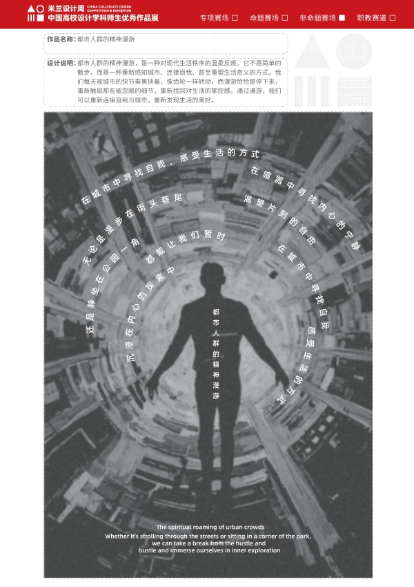 伟德国际1946姚章楠同学设计的《都市人群的精神漫游》斩获大赛一等奖。该作品通过都市人群的精神漫游,表达的是一种对现代生活秩序的温柔反叛。它不是简单的散步,而是一种重新感知城市、连接自我,甚至重塑生活意义的方式。每天被城市的快节奏裹挟着,像齿轮一样转动,而漫游恰恰是停下来,重新触碰那些被忽略的细节,重新找回对生活的掌控感。