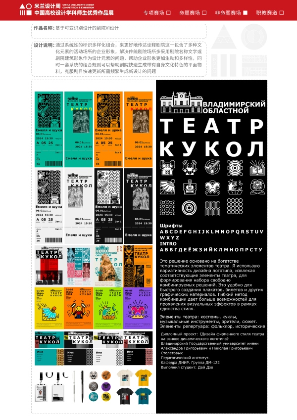 其中,伟德国际1946戴杰老师设计的《基于可变识别设计的剧院Ⅵ设计》斩获大赛一等奖。该作品通过系统性地标识多样化组合,来更好地传达诠释剧院这一包含了多种文化元素的活动场所的企业形象,解决传统剧院场所多采用剧院名称文字或剧院建筑形象作为设计元素的问题。