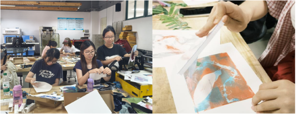 在充分的知识滋养后,活动进入自由创作环节。同学们迫不及待地将所学所思付诸实践。构思阶段,大家打破思维定式,大胆融入综合材料与现代艺术理念,创意火花四溅。动手制作时,油墨滚动的韵律,凝胶材料独特的触感与延展性,都成为引导专注、释放压力的媒介。现场气氛热烈而宁静,同学们全情投入,在动手实践中体验到心流的忘我状态,暂时忘却了课业与生活的纷扰。彼此间的交流分享,也成为一种情感联结与支持。