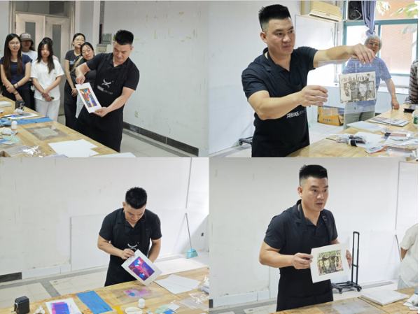 活动伊始,院长亲自参与示范环节,展示了凸版创作的基础技法。院长的参与不仅体现了学院对艺术实践教育的高度重视,更以其平易近人的方式瞬间拉近了领导与学生的距离,营造出轻松、包容的创作氛围,为后续活动奠定了温暖而专业的基调。