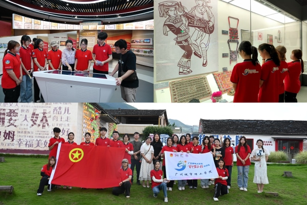 下午,实践团来到广东瑶族博物馆(中国瑶族博物馆),这是我国规模最大、藏品最丰富的瑶族文化专题博物馆。在馆内,团队成员通过沉浸式的数字化展演,系统了解了瑶族悠久的历史脉络、独特的民俗风情和灿烂的艺术成就。特别是通过3D全息投影现代科技手段,生动再现了瑶族迁徙发展的历史画卷和传统生产生活方式。在国家级非遗项目展区,实践团重点考察了“盘王节”和“耍歌堂”的活态展示,深入了解了这些传统节庆的文化内涵和保护现状。作为设计专业学生,团队成员特别关注传统元素在现代设计中的创新转化,此次调研为后续将瑶族文化精髓融入文创设计奠定了坚实基础,也为助力连南打造“世界瑶族文化艺术之都”提供了专业视角和实践方向。