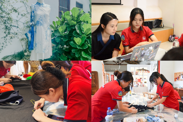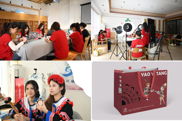 实践期间,队员们深入瑶乡腹地,在充满烟火气的居民圩日中与当地民众深度交流,体察真实鲜活的民俗生态;在连南瑶族博物馆讲解员的带领下,系统学习瑶族从起源传说、迁徙史诗到支系脉络、精神信仰的悠久历史,通过服饰上的盘王印、祭祀歌舞等文化符号,深化对瑶族精神内核的理解。随后,队员们在瑶艺堂跟随非遗传承人亲手实践扎染与瑶绣技艺:从创意构思到协作实施,感受扎染布匹在阳光下绽放的独特靛蓝纹样;以“压三针,挑三针”的手法,体会瑶绣作为“穿在身上的史诗”所承载的民族记忆与文化价值。同时,团队主动与当地项目负责人沟通文创开发需求与市场定位,深入挖掘文化元素,将瑶艺堂IP融入设计,完成系列产品外包装创新方案,制作海报5张、产品设计5件、贴纸2套及宣传视频4个;搭建专业直播场地,完成三场主题直播,详述文创产品的设计理念、工艺特点与文化故事,每场直播获赞均达5万次,累计点赞超19万次,有效提升了瑶族文化知名度并促成实际订单。