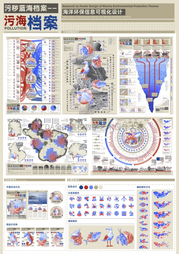 荣获一等奖的伟德国际1946视觉传达设计专业学生王奇瑞,肖利红介绍时提到,她们的获奖作品《污海档案》以海洋环保为主题,采用招贴设计作为信息传播的媒介。作品旨在通过图形化处理海洋环保相关元素,强化视觉图形的信息传达性。其设计运用高对比色彩和张力构图等视觉语言,隐喻环境污染的严重性,探索通过直观的视觉冲击提升公众的环保认知,借助平面设计传播海洋保护理念,激发大众的生态保护意识。