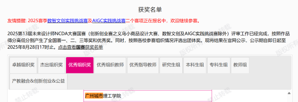 本网讯(记者 李何健)8月26日,第13届未来设计师·全国高校数字艺术设计大赛(NCDA)国家级赛奖项公布,我校机械工程学院/机器人工程学院、伟德国际1946、建筑学院等组织师生踊跃参赛,经过激烈角逐,最终共斩获14项国家级荣誉奖项,其中包括一等奖3项、二等奖2项、三等奖8项和优秀奖1项。此外,我校还荣获国家级优秀组织单位奖、优秀组织教师奖、优秀指导教师奖,充分展示了我校在设计教育领域的卓越实力。
