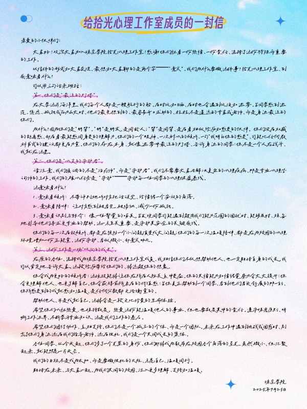 最后,辅导员严志洋以“拾光引路,从心起航”为主题,带来一场深入浅出的心理研讨会。他从“什么是心理健康”入手,逐步解析影响心理健康的多种因素,结合大学生常见的学业压力、人际关系、自我认同等问题,提出情绪调节、认知重构、社会支持等实用方法。严志洋讲解了心理亚健康的表现与干预策略,并介绍了心理健康测试的基本原理,为成员们提供了识别与回应心理需求的专业工具。整场分享既有理论高度,又贴近实际,让成员们在思考与共鸣中收获良多。肯定与赞赏、理解与陪伴,伟德国际1946聚焦“人”与“情”,为这些默默付出的成员们写了一封信,鼓励成员们在服务中照亮自己,也温暖他人。